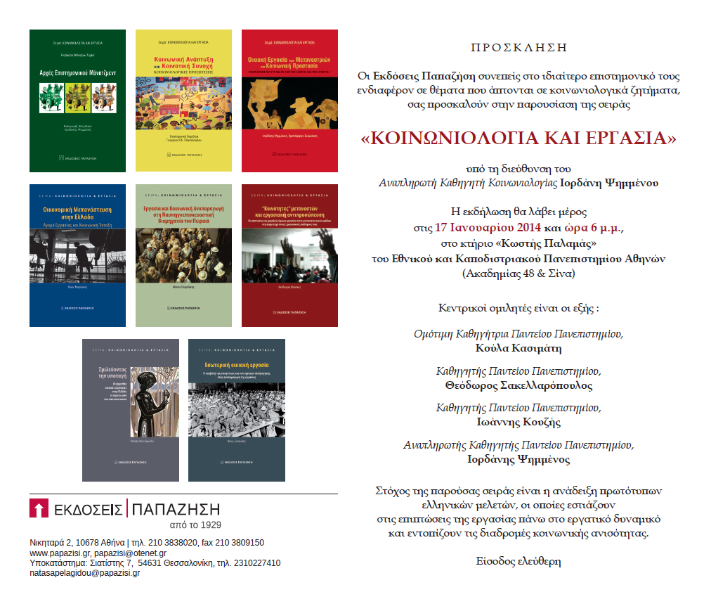 17/01/14, 6pm, Book Series Presentation: “Sociology and Work” Papazisi Publishers