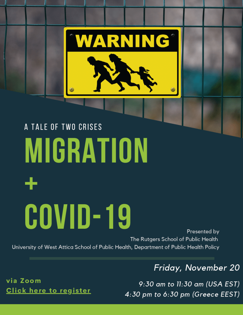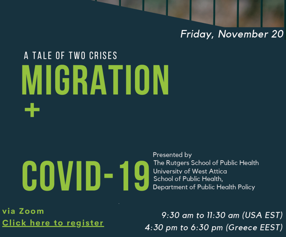 WEBINAR: A TALE OF TWO CRISES: ΜIGRATION AND COVID-19 [THE RUTGERS SCHOOL OF PUBLIC HEALTH – UNIVERSITY OF WEST ATTICA SCHOOL OF PUBLIC HEALTH, DEPARTMENT OF PUBLIC HEALTH POLICY, 20 NOV. 2020]