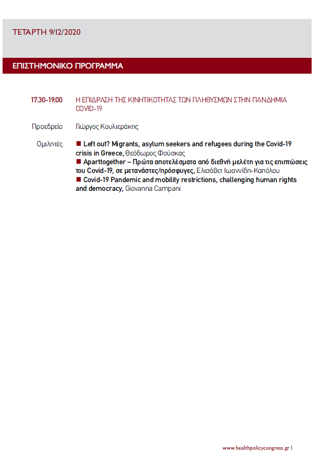 2020 PANHELLENIC CONGRESS: “PUBLIC HEALTH POLITICAL ECONOMY OF THE COVID-19 PANDEMIC”: THEODOROS FOUSKAS, “LEFT OUT? MIGRANTS, ASYLUM SEEKERS AND REFUGEES DURING THE COVID-19 CRISIS IN GREECE” PANEL THE EFFECT OF POPULATION MOBILITY ON THE COVID-19 PANDEMIC [9 DEC. (7-10 DEC.) 2020, ONLINE]