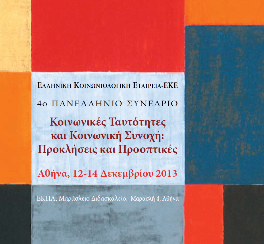 Η Ελληνική Κοινωνιολογική Εταιρεία (ΕΚΕ) σας προσκαλεί στο 4ο Πανελλήνιο Συνέδριο που θα πραγματοποιηθεί στις 12-14 Δεκεμβρίου 2013, στο Μαράσλειο Διδασκαλείο (Μαρασλή 4, Αθήνα) με θέμα: Κοινωνικές Ταυτότητες και Κοινωνική Συνοχή: Προκλήσεις και Προοπτικές