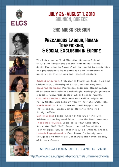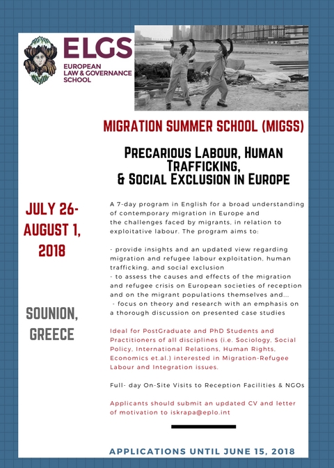 2018 MIGRATION SUMMER SCHOOL (MIGSS) ON PRECARIOUS LABOUR, HUMAN TRAFFICKING, & SOCIAL EXCLUSION IN EUROPE (JULY 26-AUGUST 1, 2018), EPLO PREMISES IN SOUNION, GREECE Published on April 19, 2018July 10, 2018 by Theodoros Fouskas Share this: Click to share on X (Opens in new window) X Click to share on Facebook (Opens in new window) Facebook Click to share on LinkedIn (Opens in new window) LinkedIn Click to email a link to a friend (Opens in new window) Email Like Loading... Related